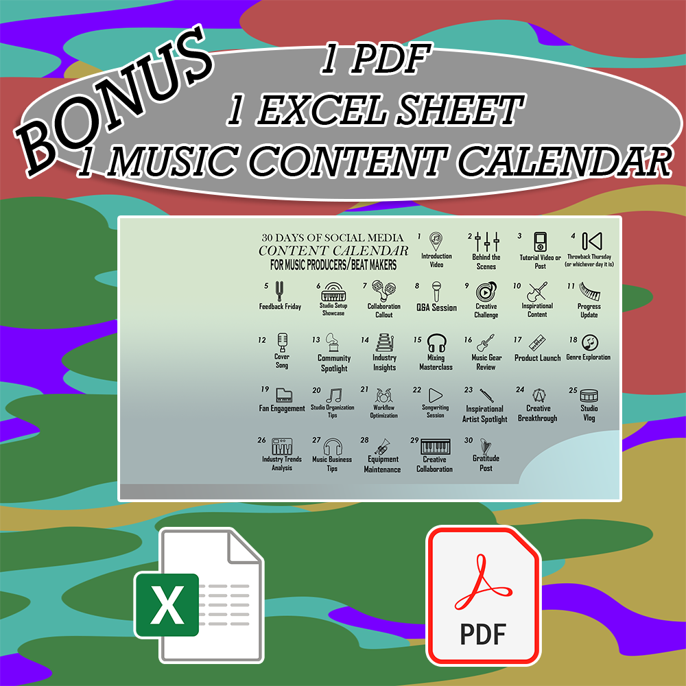 1 Producer Content Calendar that includes 30 days worth of content ideas such as Mixing Masterclass, Studio Vlog, Inspirational Content, Tutorial Video & more.